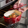 De geëmailleerde gietijzeren braadpan is geschikt voor alle soorten fornuizen, inclusief inductie, oven en grill tot 260 °C (hij kan echter niet op open vuur worden gebruikt).